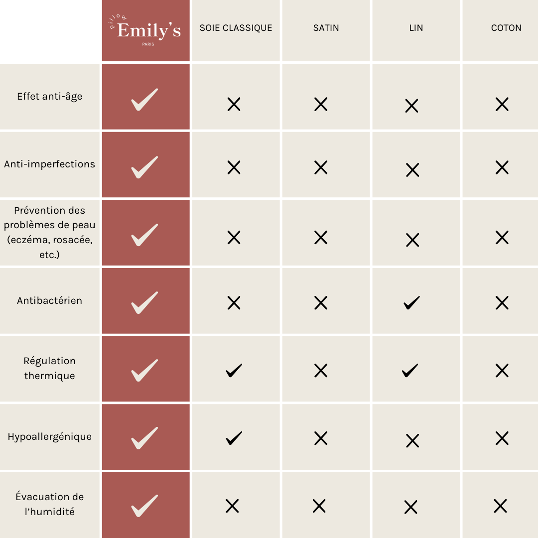 Contrairement à d'autre matière, la soie est hydrophobe,elle n'absorbe pas vos soins, vous permettant d'en profiter toute la nuit !